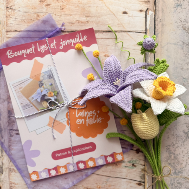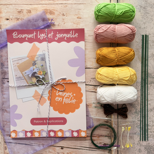 Avec ce kit crochet, tu réalises un bouquet composé de 5 fleurs : un lys (couleur au choix), une jonquille blanche et jaune, une tulipe fermé jaune pastel, un bourgeon sauvage et une branche de bourgeons jaune.