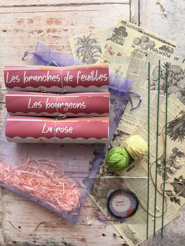 Avec ce kit crochet, tu réalises un bouquet personnalisé composé d’une petite branche de feuilles, d’une branche de bourgeons et d’une fleur.