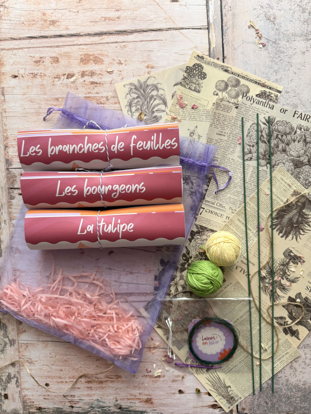 Avec ce kit crochet, tu réalises un bouquet personnalisé composé d’une petite branche de feuilles, d’une branche de bourgeons et d’une fleur.