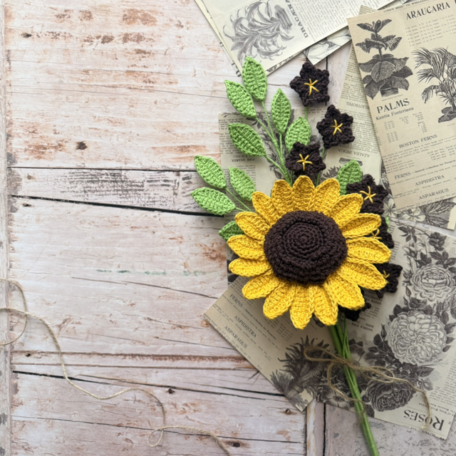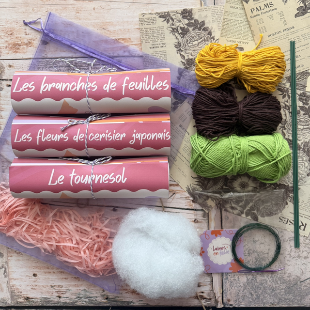 Avec ce kit crochet, tu réalises un bouquet composé d’un tournesol, d’une branche de fleurs de cerisiers et d’une grande branche de feuilles.